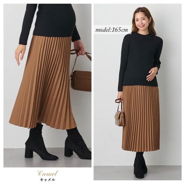 きちんと感を演出してくれるプリーツスカート。ピッチが細かいアコーディオンプリーツなのでクラス感があり、大人っぽい雰囲気で着られます。さらりとした素材とシックな色合いで、季節を先取りしたいこれからの時期に大活躍。お腹はやわらかなベア天竺がやさしくフィットするので、マタニティから産後まで長く着られます。