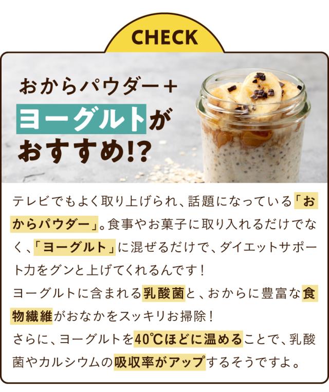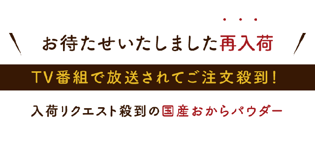 栄養価の高い「おから」の欠点、“腐りやすくて日持ちがしない”を解消した「おからパウダー」がいま大注目!もともと栄養価に優れた「おから」を乾燥させることで、さらに栄養が凝縮!多くの食物繊維を含むだけでなく、低糖質で高タンパクと、まさに理想的な健康食品といえます。おからドーナツ・ハンバーグなど、様々なお料理にお使いいただけます。
