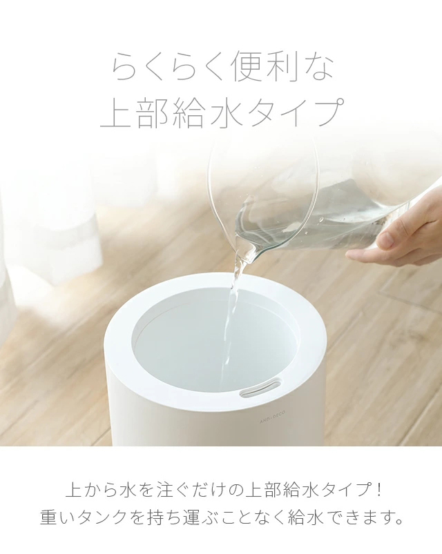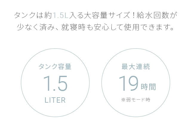 蓋を外し上部より水を流し込むだけなので給水が簡単。コンパクトながら水タンクは約1.5L入る大容量サイズの為、給水回数が少なく済み就寝時も安心してご使用いただけます。