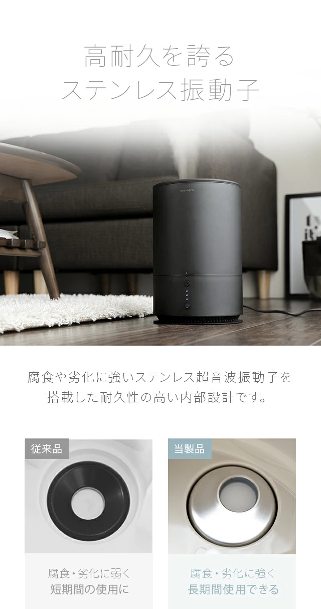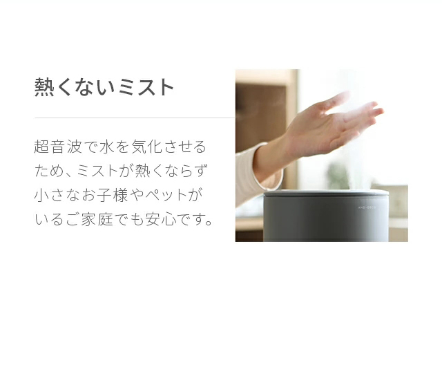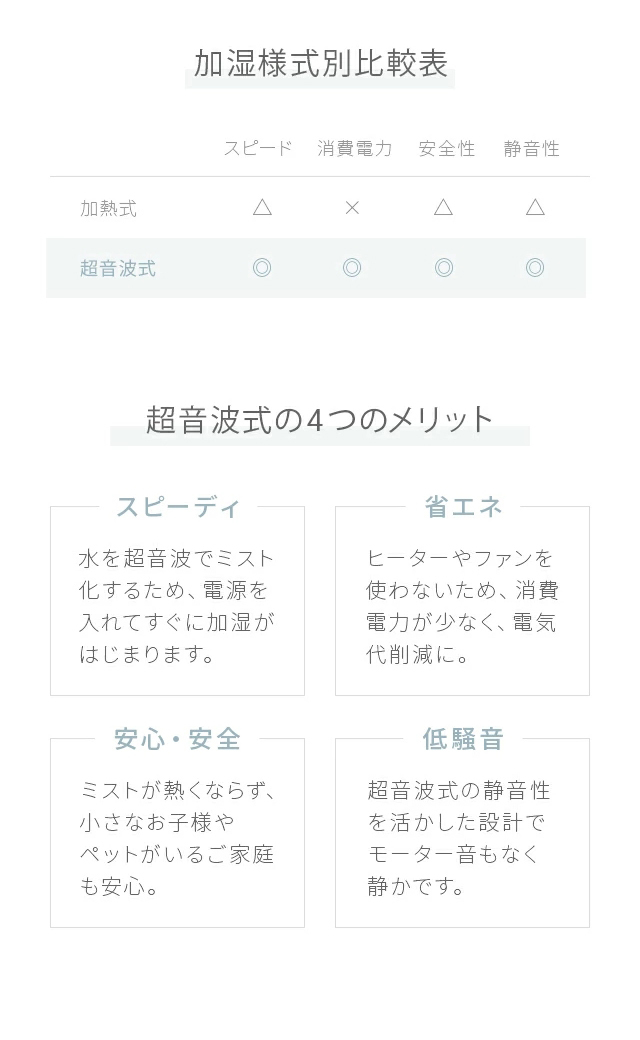 水を振動させ微細なミストにする超音波方式を採用。優れた加湿速度と省エネを性能が特徴です。