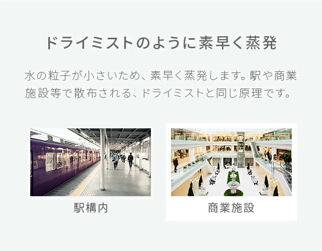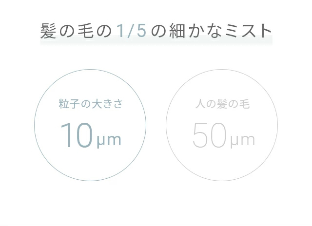 人の髪の毛よりも細かい10μmのミストを採用。自然蒸発しやすい為、床や加湿器周辺が濡れにくく快適に使用いただけます。