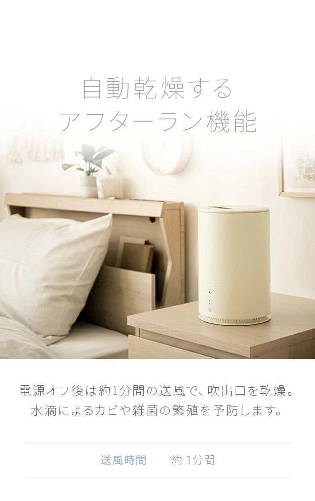 電源OFF後は約1分間送風を行い吹きだし口を乾燥させます。水滴が残ることによるカビや雑菌の繁殖を防ぎます。