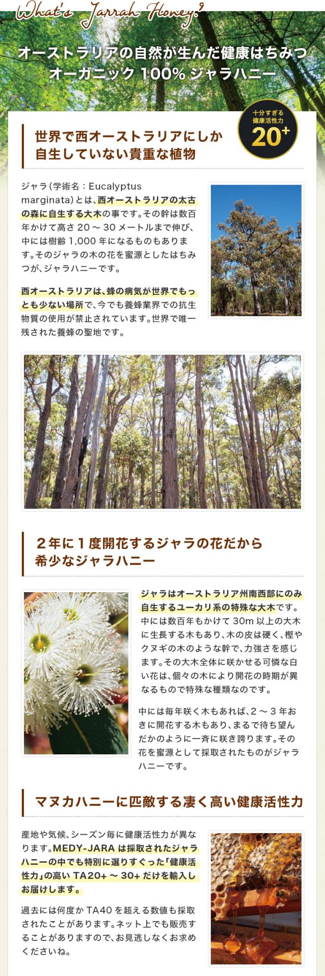 クリーンで安心・安全の西オーストラリアの太古の森に自生する「ジャラ(ユーカリ属)」という木の花の恵み。まさしくジャラハニーは天然のサプリメント!貴重な森の恵みを、是非あなたの健康維持にお役立てください。