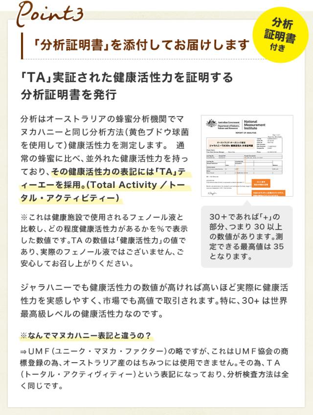■マヌカハニーと同様の健康活性力でしかも超高数値!マヌカハニーと同様の検査方法で、オーストラリア分析機関より発行した証明書を添付してお届けします。