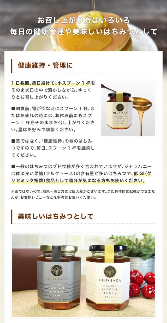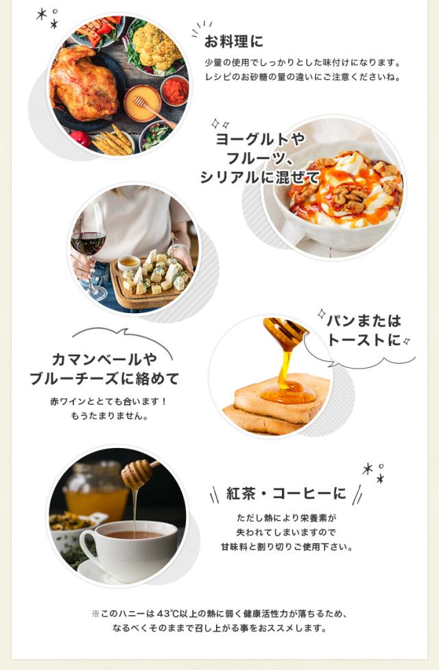 健康維持管理に1日数回、毎日続けて小スプーン一杯をそのまま口の中で溶かしながら、ゆっくりとお召し上がりください。美味しい蜂蜜として、ヨーグルトやフルーツ、シリアルに混ぜて、お料理やコーヒー・紅茶に入れてなど様々です。