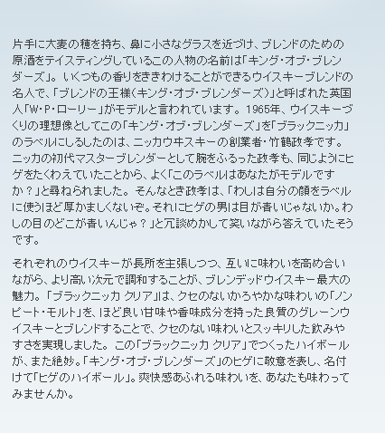国産ウイスキー愛好家、ハイボール愛好家大注目!業務店様も必見!日本のウイスキーの父と言われる、ニッカウヰスキーの創業者竹鶴政孝は、本場スコットランドに負けない本物のウイスキーを造りたいという思いから、一貫してウィスキーづくりにおけるブレンドの重要性を説き、それを実践。ニッカは今もなおその精神と技術を受け継ぎ、本物のウイスキーづくりにこだわり続けています。ブラックニッカクリアはノンピートモルト(ピートを使用せず乾燥させたピート由来のスモーキーフレーバーの無い大麦麦芽)を使用することで、やわらかな香りとまろやかな味わいを実践したクセのないクリアな飲み心地。ヒゲのおじさんでもおなじみのブラックニッカクリアをぜひ一度ご賞味ください。
