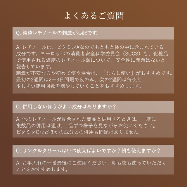 ※他のレチノールが配合された商品と併用するときは、一度に複数品の併用は避け、1品ずつ様子を見ながらお使いください。