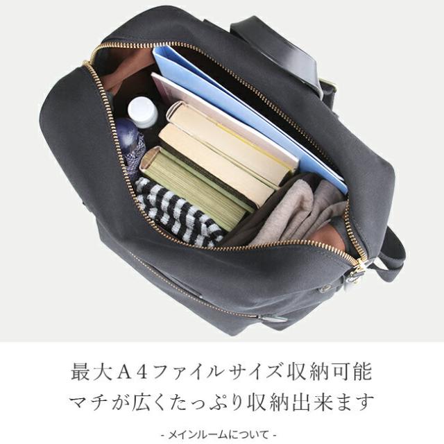 シンプルな1気室のメインルームは、最大A4ファイルサイズが収納可能です。そのほかにも、分厚い本や500mlペットボトルに折りたたみ傘、タオル、ちょっとした着替えなんかも入ります。マチがとても広いので、思っている以上にたっぷりと荷物を収納することが出来ます。普段使いはもちろん、旅行時のサブバッグや、1泊程度であれば旅行かばんとして使用することも出来ます。