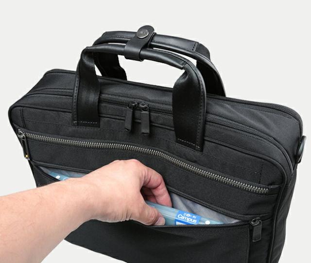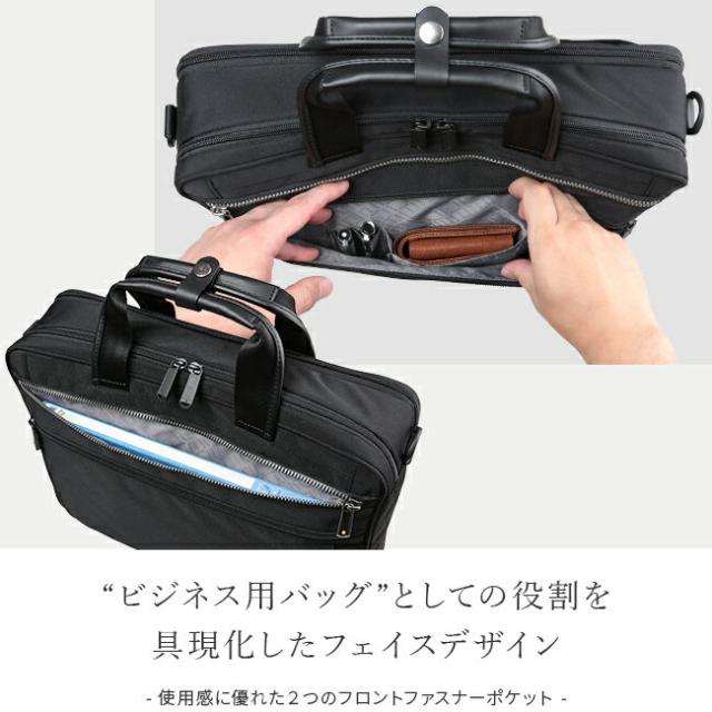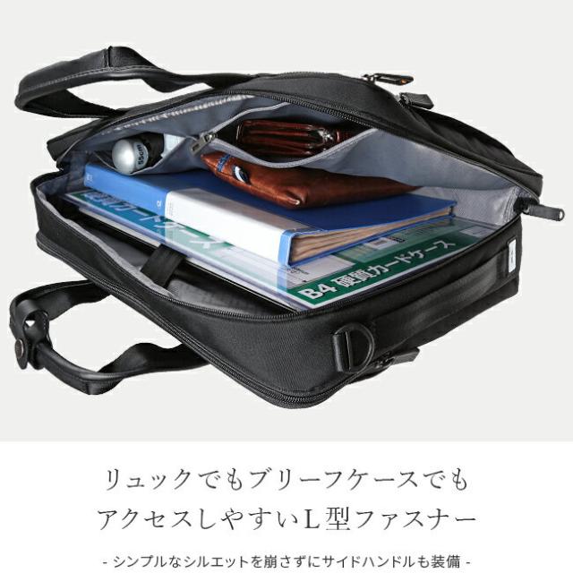 ■リュックとして使用する場合にも、ブリーフケースとして持ち運ぶ際にも、メイン収納部へのアクセスに困らないよう、ダブルファスナーがL字に配置された設計です。■サイド面に配置されたハンドルも、使いやすさのポイントです。ビジネスリュックとして使用中のトップハンドルとしてはもちろん、電車の網棚等から取り出す際にも役立ちます。