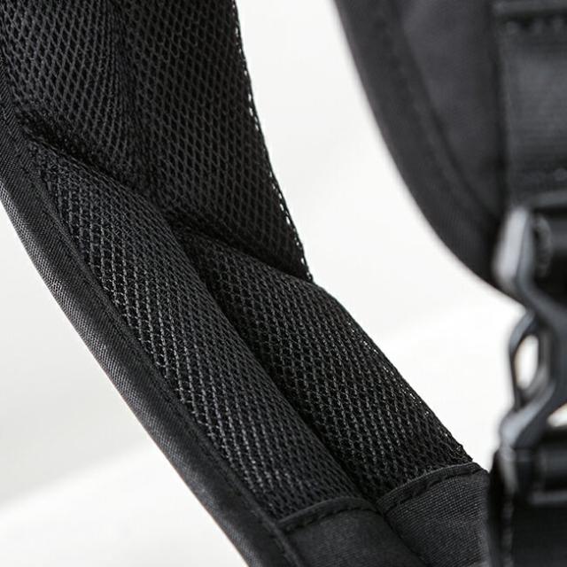 | 収納可能なリュックベルト。裏地は立体メッシュ素材でムレを軽減します。 | 着脱可能なショルダーベルトが付属。ズレが気になるパッドは付属しておりません。 |