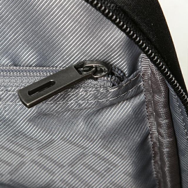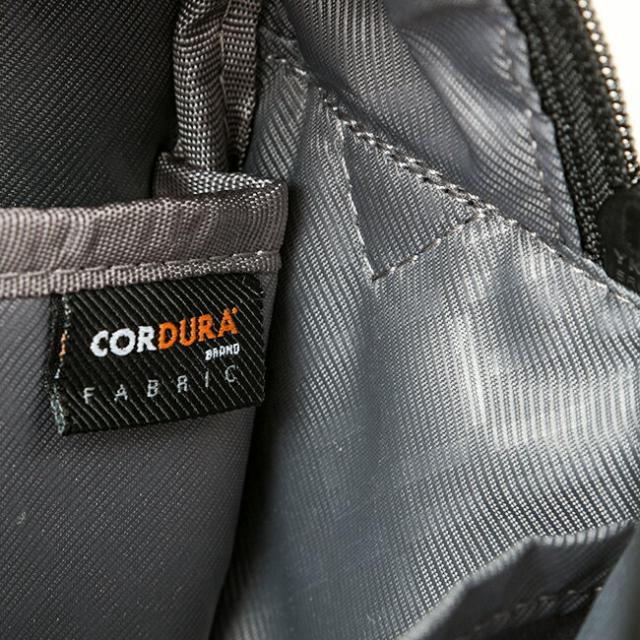 | 頼もしいコーデュラ・ファブリックのタグは控えめに主張します。 | メイン気室内には長財布も余裕をもって収納可能なファスナーポケットを配置。 |