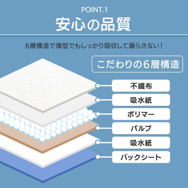 抗菌・高吸収ポリマーと100%パルプを使用しているので、おしっこの広がりや逆戻り、ニオイを抑えます。