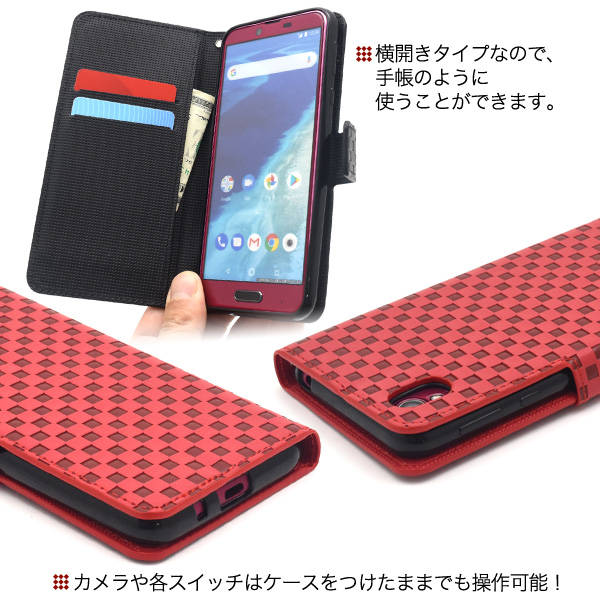 スマートフォンケース AQUOS sense plus SH-M07 Android One X4 Y mobile 用 手帳型 市松模様デザイン シンプル レザーケース