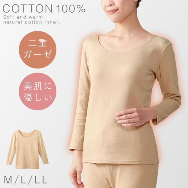 インナー レディース シャツ 肌着 ダブルガーゼ 綿100% 長袖 衿ぐり 広め 9分袖 あったか 暖かい ベージュ ふんわりガーゼあたたかコットンインナー
