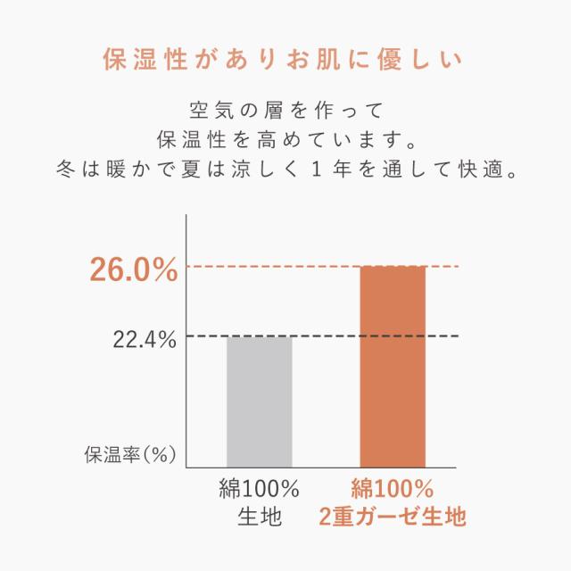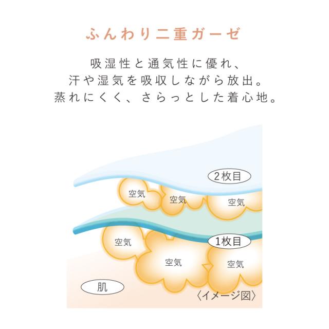ガーゼ生地は吸湿性と通気性に優れ、汗や湿気をしっかり吸収しながら放出するので、蒸れにくく、さらっとした着心地。