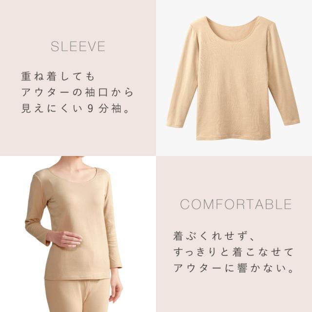 重ね着してもアウターの袖口から見えにくい9分袖。保温できる長袖でありながら、手首を完全に覆わないため、蒸れにくく快適です。