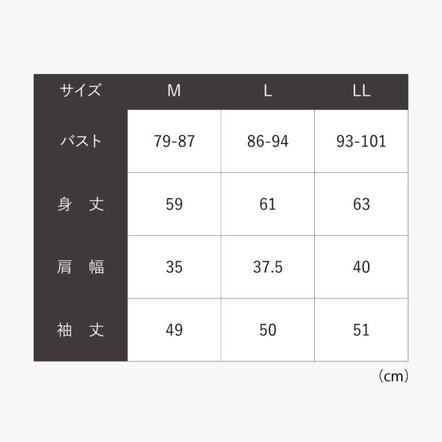 ■サイズ:M/バスト79-87、身丈59、肩幅35、袖丈49cm、L/バスト86-94、身丈61、肩幅37.5、袖丈50cm、LL/バスト93-101、身丈63、肩幅40、袖丈51cm