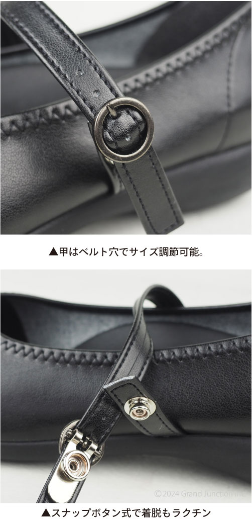 こちらは通勤・リクルート・冠婚葬祭等フォーマルなシーンでも使いやすい黒ソール仕様のパンプス。2.5cmのほぼフラットなヒールで長時間の着用でも快適! つま先はころんとまあるいシルエットの「ラウンドトゥ」デザインを採用。穏やかな丸みが、足元を女性的で愛らしい印象にしてくれます。 甲のストラップはスナップボタンで着脱ラクチン!ベルト穴で長さの調節でき、ゴムに切り替えられているので、甲高幅広の方でも安心です!足を固定させる役割も果たすので、長時間の着用でも疲れにくいのが嬉しい!