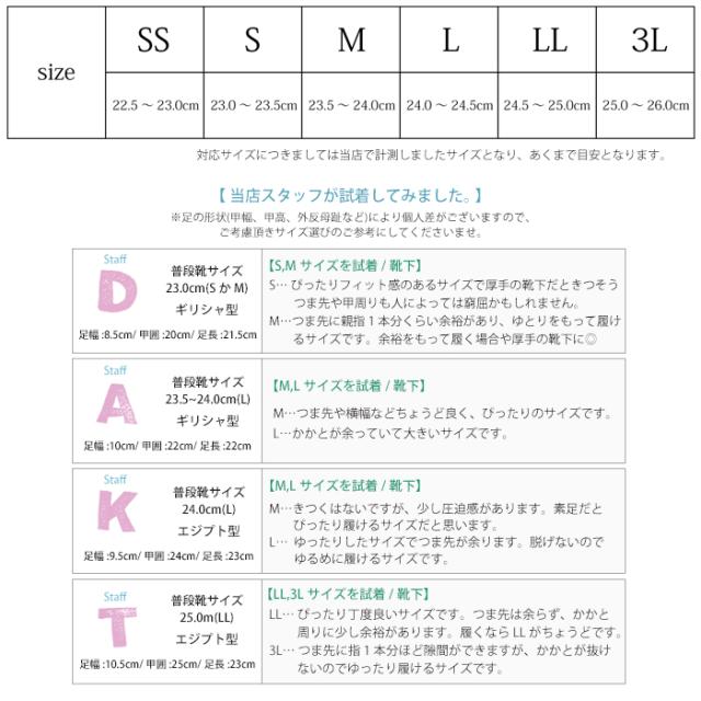 SS(22.5〜23.0cm)、S(23.0〜23.5cm)、M(23.5〜24.0cm)、L(24.0〜24.5cm)、LL(24.5〜25.0cm)、3L(25.0〜26.0cm)