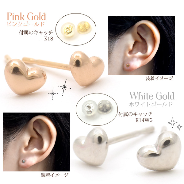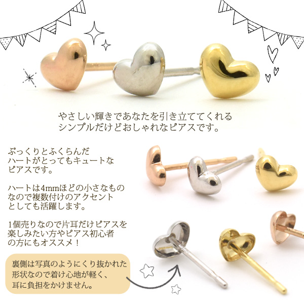 ピアス 片耳売り K18 ぷっくりハートピアス 日本製 18金 ゴールドピアス 軽やかな着け心地 ピンクゴールド イエローゴールド ホワイトゴールド はーと pg yg wg 軽い ギフト プレゼント 贈り物 送料無料