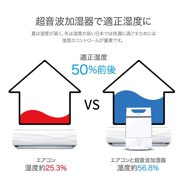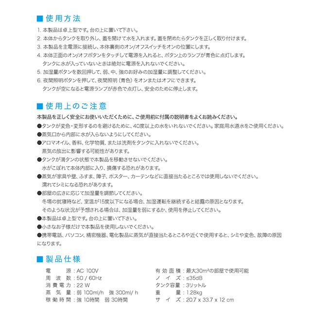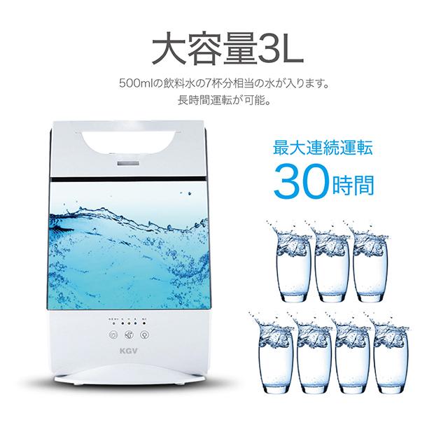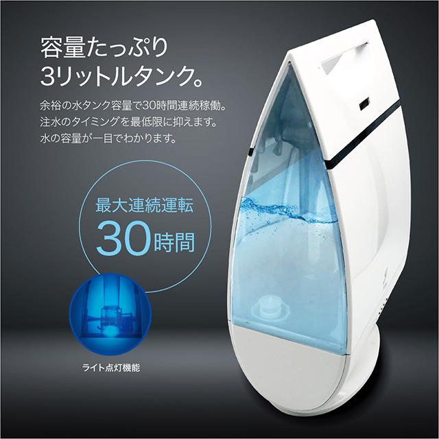 タンクの容量が3リットルの大容量。加湿量、弱で最大30時間運転可能。