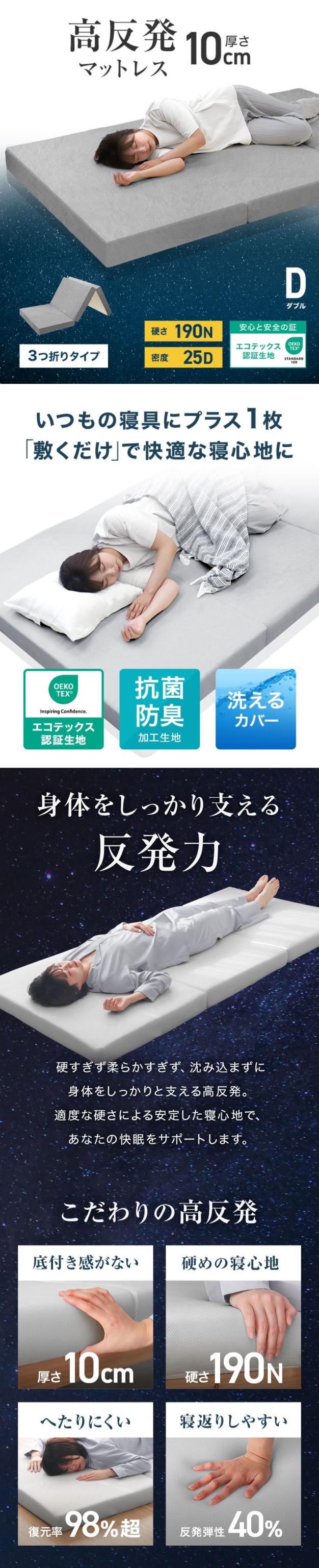 マットレス ダブル 三つ折り 高反発 極厚 10cm 190N 高品質 みつ折り 高反発マット 高反発マットレス 折り畳み マット ベッドマット ベッド 折りたたみ 高反発マットレス 腰痛 体圧分散 布団 敷き布団 敷布団 寝具 新生活 D