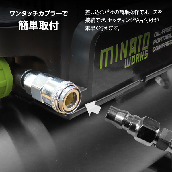 ミナト エアーコンプレッサー オイルレス型 CP-8A+エアーツール3点付きセット (100V) 8Lタンク搭載の小型エアーコンプレッサーです。DIY用途として十分な性能を持ち、家庭用100V電源で各種エアー工具が手軽に扱えます。オイルフリータイプで油分が混じらないクリーンなエアーで、塗装作業や精密機械のホコリ飛ばしに最適です。またオイル交換や管理が不要なためメンテナンスも容易です。