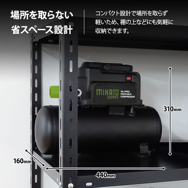 - メリットで有りデメリットです、コンパクトで場所は取らないのですが、コンプレッサーの置場に制限が無いので有れば大きいサイズの物をお勧めします。車のタイヤの空気圧の調整だと2本位までで3本目でコンプレッサ...