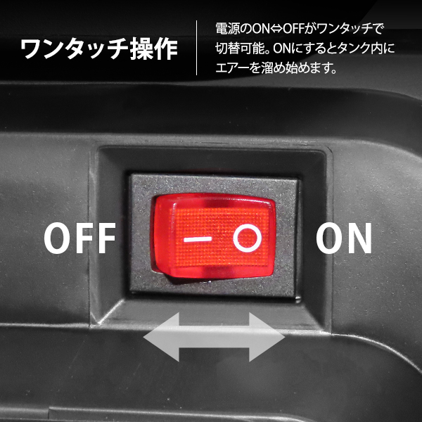 電源スイッチ付き 電源スイッチ付きで、電源のON⇔OFFがワンタッチで切替可能。ONにするとタンク内にエアーを溜め始めます。