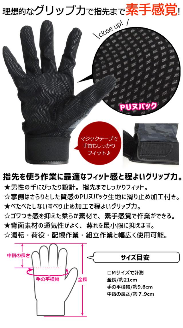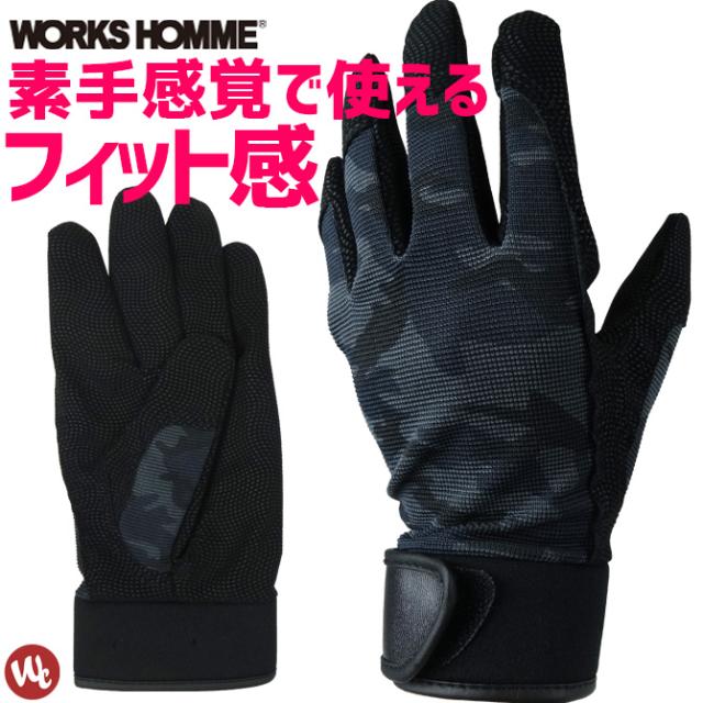 | ユニワールドの作業手袋WORKS HOMME「指先の巧」です。 チカラ仕事を支え、指先の仕事に応える、素手感覚とグリップ力がベストにマッチングしたワークグローブです。 手のひらにあたる部分はしっとりとしたヌバック調仕上げのPUを採用し、素手で物をつかむような感触です。 手袋表面の熱転写加工との組み合わせで、他では見られないグリップ力を実現しています。 柔軟性のある複数の素材の組み合わせにより包み込むようなフィット感があり、手の甲はストレッチ素材で通気性のある背抜き仕様ですので、グラブの中の熱を逃がしてくれムレにくく快適です。 どんなワークウェアともマッチするシンプル&スタイリッシュな迷彩デザインもポイントです。 重機運転、荷役・運送、配線作業、組立て作業など、幅広くお使いいただけます。 | ||||||