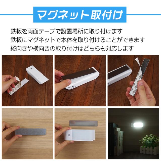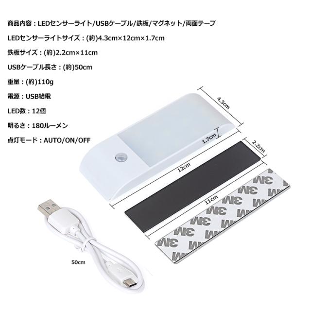 【商品内容】:LEDセンサーライト/USBケーブル/鉄板/マグネット/両面テープ