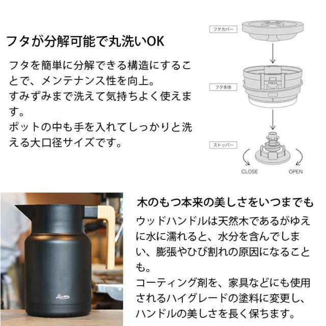 | 材質 | 18-8ステンレス鋼(本体/フタ) / ポリプロピレン(本体、フタ) / ビーチウッド(ハンドル)/ポリアセタール(フタ)/シリコーンゴム (フタ/ハンドル)/ ステンレス鋼(フタ/ハンドル) |