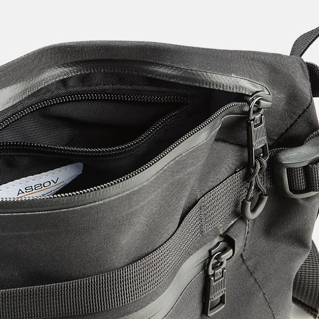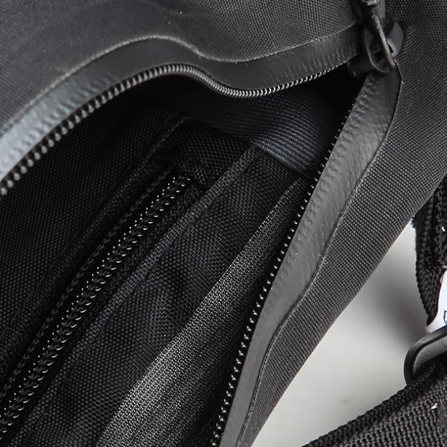 収納部はフロントポケットとメインコンパートメントの2箇所で構成。どちらも止水ファスナーを採用しているので、雨水から荷物をしっかり保護します。メインコンパートメントはダブルファスナーとなるため、左右どちらの肩で背負っていても開閉がしやすいのもポイントです。A5サイズ対応のメインコンパートメントの中には内ポケットを1箇所搭載しているので、荷物の仕分け収納も可能。