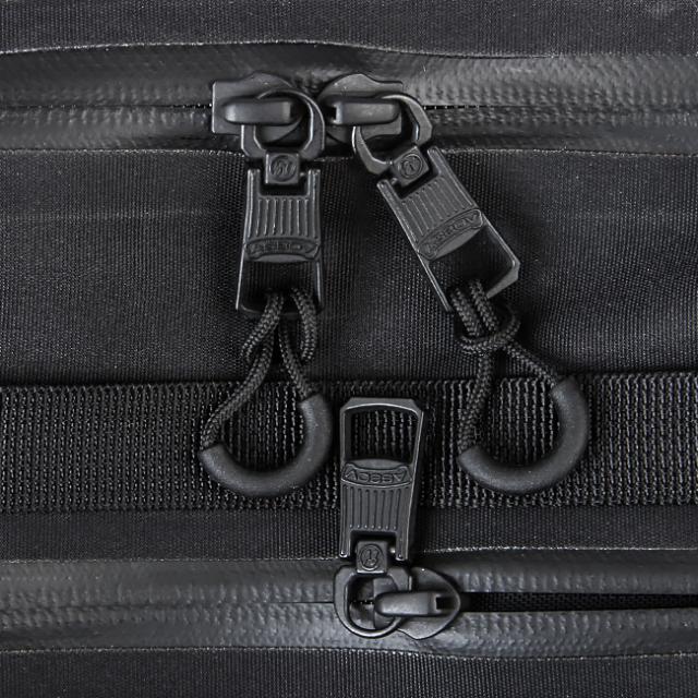 | ファスナー引手はマットで武骨なデザイン。 | サイドにモノを提げるためのフックを装備。 |