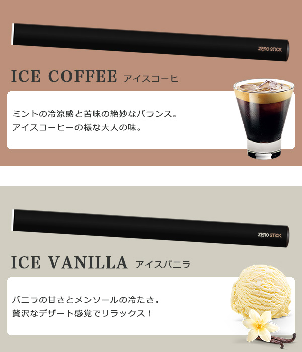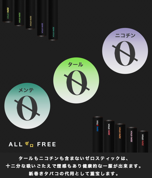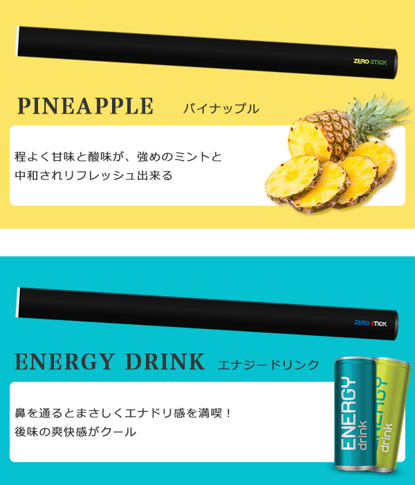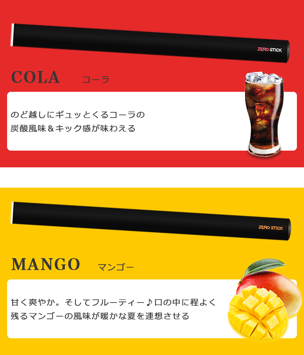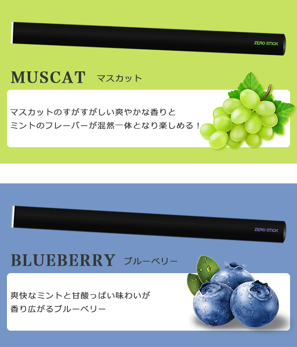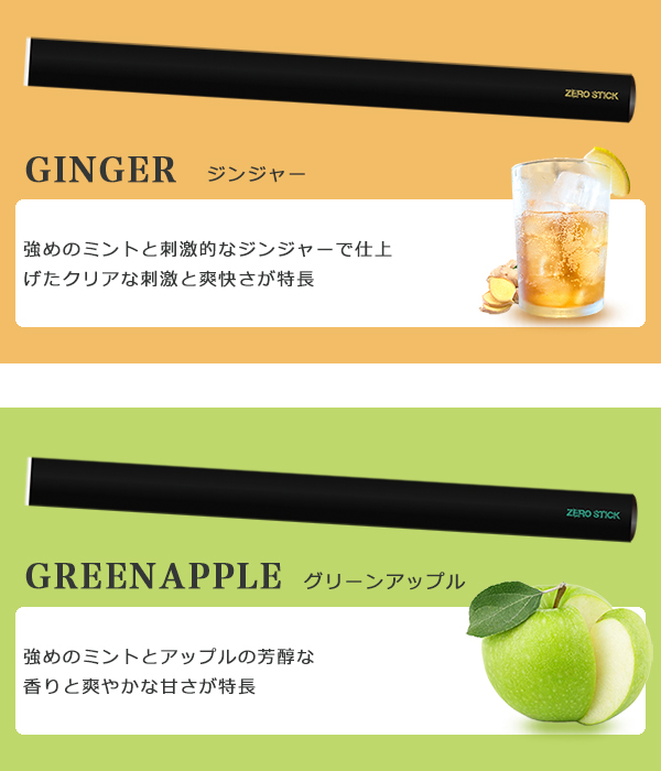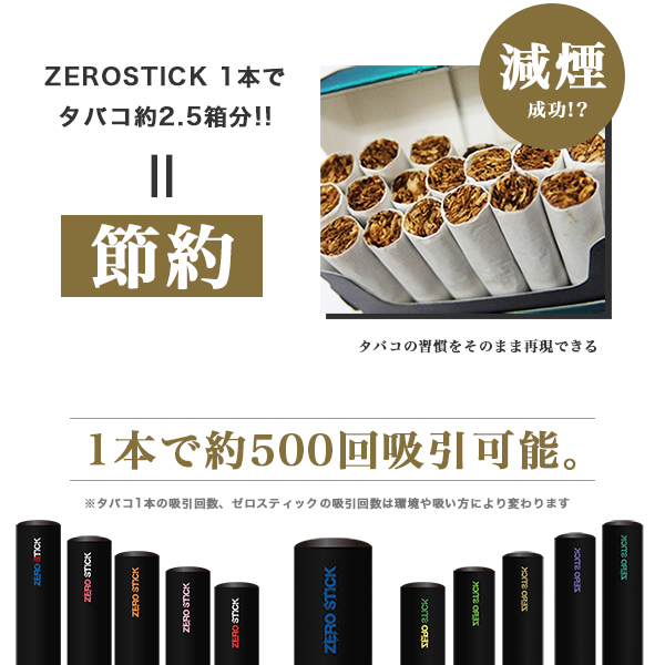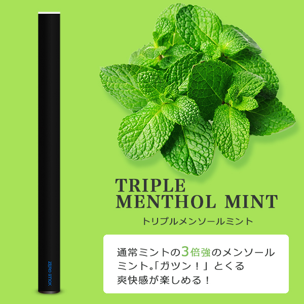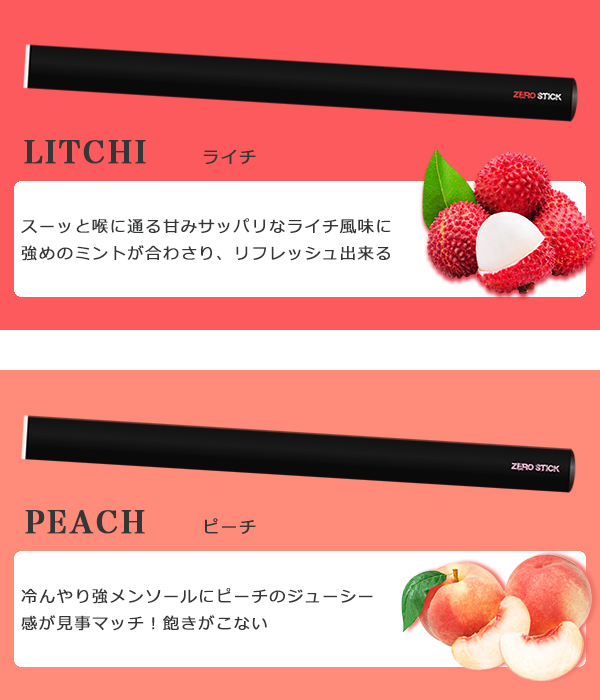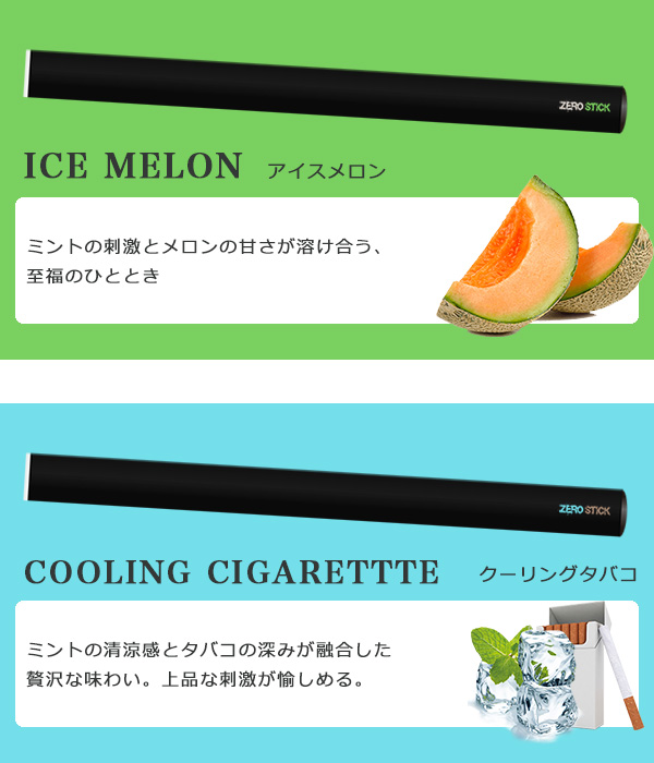 【ゼロスティックは喫煙者やストレス解消を求める方におすすめの商品です】 使い捨て電子タバコ「ゼロスティック」は、手軽で便利な禁煙サポートアイテムとして多くの喫煙者から高い評価を受けています。 水蒸気を吸うことで、ニコチンゼロでありながらも本物のタバコ感に近い吸い心地を実現し、ストレス解消に効果的です。 11種類のフレーバーが揃っており、お好みの味をお楽しみいただけます。 他の電子タバコと比較しても、リーズナブルな値段で購入できるため、経済的な負担を軽減できます。 ・商品の特長 ゼロスティックは、ニコチンゼロでありながら、本物のタバコに近い吸い心地を実現。 様々なフレーバーが揃っており、個性豊かな味わいをお楽しみいただけます。さらに求めやすい価格で継続的な使用にも適しています。 ・使い方 ゼロスティックは開封後すぐに使えます。使い終わったら、そのまま捨てられる使い捨てタイプなので手間もかかりません。 【電子タバコの水蒸気の秘密】 電子タバコは、プロピレングリコールやグリセリン(これらは霧を作るための成分)、フレーバー(風味をつける成分)を 含む液体(リキッド)を加熱して発生した水蒸気を吸引するアイテムです。 電子タバコの大きな特徴は、火を使わずに発生した水蒸気を吸引することで、たばこのような吸い心地を楽しめる点です。 これは普通の紙巻きタバコがタバコ葉を火で燃やして出た煙を吸うのとは異なり、電子タバコはバッテリーからの電力で アトマイザー内のコイルを加熱し、リキッドを蒸気化させる仕組みになっています。 【ゼロスティックはこんな方におすすめ】 禁煙を始めたい方や、タバコのストレスを軽減したい方におすすめです。休憩時間など、さまざまな場面で手軽に使えます。 ・場所を気にせず手軽にリフレッシュしたい。 ・禁煙を初めてから口が寂しい時。 ・気軽に吸いたい、気分転換や口寂しいとき(部屋や車内etc)。 ・喉へのキック感、タバコ同様の煙感や吸いごたえが気になる方。 ・満足する美味しいフレーバーを探してる方。 ・タバコの本数を減らしたい方。 ・加熱式電子タバコのような面倒な掃除はしたくない方。 【タールもニコチンもゼロ】 ゼロスティックは、タールやニコチンが一切含まれていないため、健康に対する懸念を軽減できます。 タバコの代替品として、リラックスタイムやストレス解消に活用できることで、安心で健康的な喫煙スタイルを送ることができます。 喫煙習慣を見直し、ストレスフリーな生活を実現できるよう是非ゼロスティックをお使いください。 【タバコ約2.5箱分を楽しめる驚きのコストパフォーマンス】 1本でなんとタバコ約2.5箱分(約500回の吸引)も楽しめる、驚くべきコストパフォーマンスを誇ります。 タールもニコチンもゼロで、健康面でも安心して利用できるだけでなく、お財布にも優しい商品です。 従来のタバコと比較しても、圧倒的なコスパを実現。気軽に手に取りやすい価格で、 禁煙を成功させたい方や、ストレス解消を求める方にも喜ばれること間違いなしです。 ※タバコ1本の吸引回数、ゼロスティックの吸引回数は環境や吸い方により変わります。 【16種類のフレーバー】 ゼロスティックの11種類のフレーバーは、さまざまな好みに対応できる幅広いラインナップが魅力です。 それぞれのフレーバーが持つ独自の味わいや特徴を楽しんで、お気に入りを見つけよう。 ◆トリプルメンソールミント 通常ミントの3倍強のメンソールミント。「ガツン!」とくる爽快感が楽しめる! ◆トリプルメンソールミント×ブルーベリー 爽快なミントと甘酸っぱい味わいが香り広がるブルーベリー。 ◆トリプルメンソールミント×グリーンアップル 強めのミントとアップルの芳醇な香りと爽やかな甘さが特長。 ◆トリプルメンソールミント×ジンジャー 強めのミントと刺激的なジンジャーで仕上げたクリアな刺激と、爽快さが特長 ◆トリプルメンソールミント×マスカット マスカットのすがすがしい爽やかな香りとミントのフレーバーが混然一体となり楽しめる! ◆トリプルメンソールミント×パイナップル 程よく甘味と酸味が、強めのミントと中和されリフレッシュ出来る。 ◆トリプルメンソールミント×エナジードリンク 鼻を通るとまさしくエナドリ感を満喫!後味の爽快感がクール。 ◆トリプルメンソールミント×コーラ のど越しにギュッとくるコーラの炭酸風味&キック感が味わえる。 ◆トリプルメンソールミント×マンゴー 甘く爽やか。そしてフルーティー♪口の中に程よく残るマンゴーの風味が暖かな夏を連想させる。 ◆トリプルメンソールミント×ライチ スーっと喉に通る甘みサッパリなライチ風味に強めのミントが合わさり、リフレッシュ出来る。 ◆トリプルメンソールミント×ピーチ 冷んやり強メンソールにピーチのジューシー感が見事マッチ!飽きがこない。 ◆メンソールミント×アイスメロン ミントの刺激とメロンの甘さが溶け合う、至