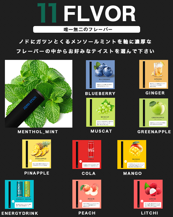 通常より3倍強のメンソールミントに11種類のフレーバーを加えた電子タバコを是非ご堪能あれ!