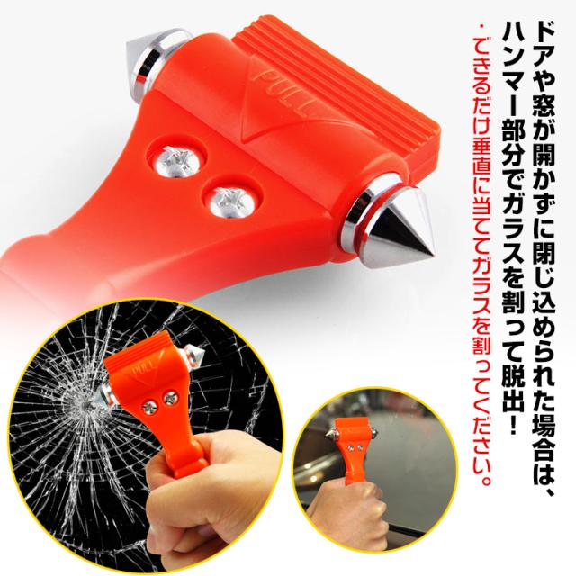 ■ハンマーでガラスを割り、カッター部分でシートベルトを切断し脱出!!