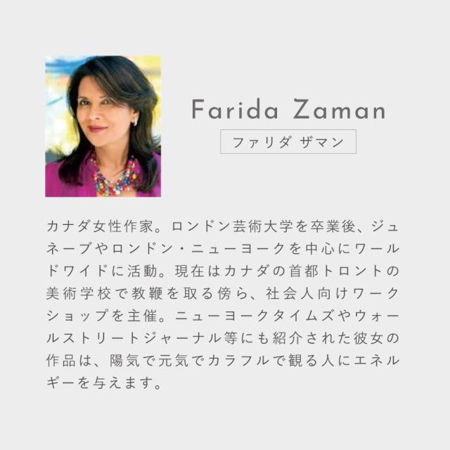 カナダ女性作家。ロンドン芸術大学を卒業後、ジュネーブやロンドン・ニューヨークを中心にワールドワイドに活動。現在はカナダの首都トロントの美術学校で教鞭を取る傍ら、社会人向けワークショップを主催。ニューヨークタイムズやウォールストリートジャーナル等にも紹介された彼女の作品は、陽気で元気でカラフルで観る人にエネルギーを与えます。