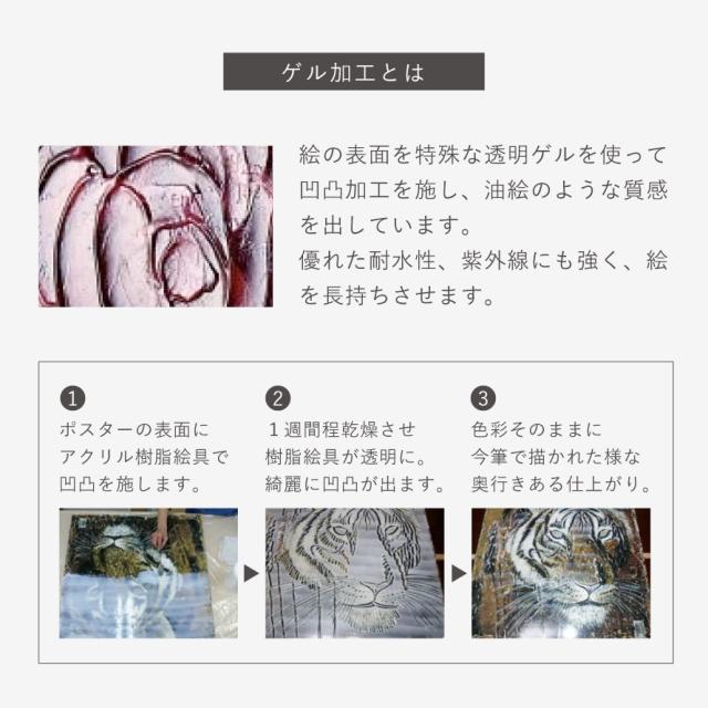 ポスター表面に直接加工を施すため、保護に用いるガラスやアクリルが不要なので、絵の色がより鮮やかに表現され、しかも軽くなるので扱いやすく(壁にかけやすく)なります。熟練した職人によるで凹凸加工により、本物の油絵の様なリッチな質感。耐水性もあり、乾いた柔らかい布でサッと拭くだけの簡単お手入れ。