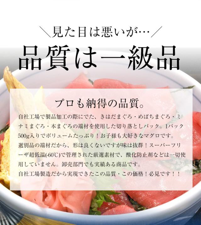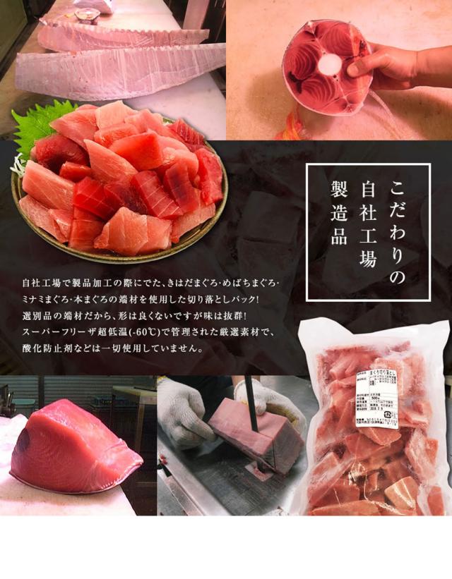 自社工場で製品加工の際にでた、キハダマグロ、メバチマグロ、ミナミマグロ、本マグロの端材を使用した切り落としパックです。