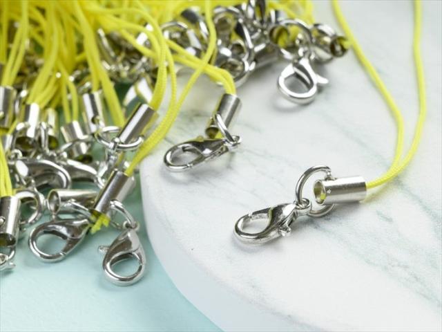 ストラップパーツ カニカン付き 丸カン シルバー金具 イエロー 全長約90mm 紐長さ約70mm 約50個 ネオンカラー 紐 ひも キーホルダー アクセサリーパーツ