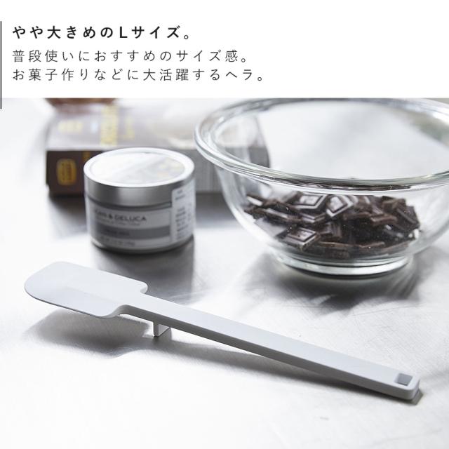 シリコーン製で滑りにくく、弾力のある素材で、フッ素加工(テフロン加工)のフライパン、鍋などを傷つけないヘラ。普段使いにちょうどいい、やや大きめ26cmのLサイズ。
