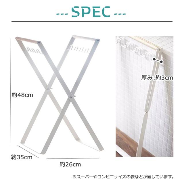 凹凸のフックにレジ袋の取っ手をかけるだけで、簡単にゴミ箱になるゴミ袋スタンド。