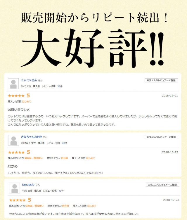- 他の乾燥ワカメと違って、ワカメの品質が良い! 食べやすいカットがされているし、太いスジみたいのが入ってないのでgood!
