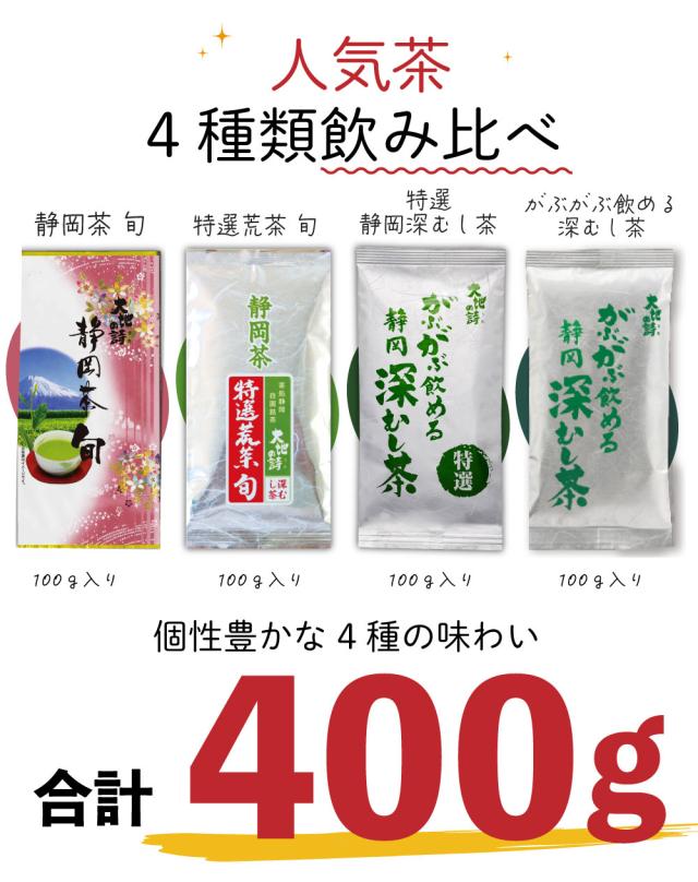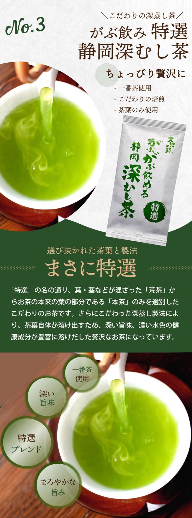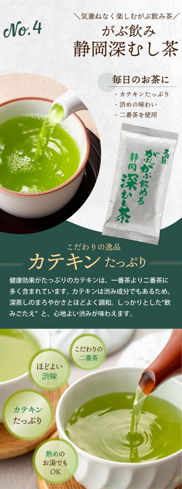 ワンランク上の上級茶「静岡茶・旬」、本茶・茎茶・芽茶・粉茶の全て詰まった大人気の荒茶「特選荒茶・旬」こだわりの深むし茶「がぶ飲み特選静岡深むし茶」!気兼ねなく楽しくがぶ飲み「がぶ飲み静岡深むし茶」