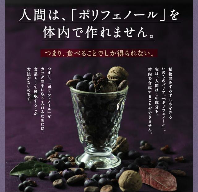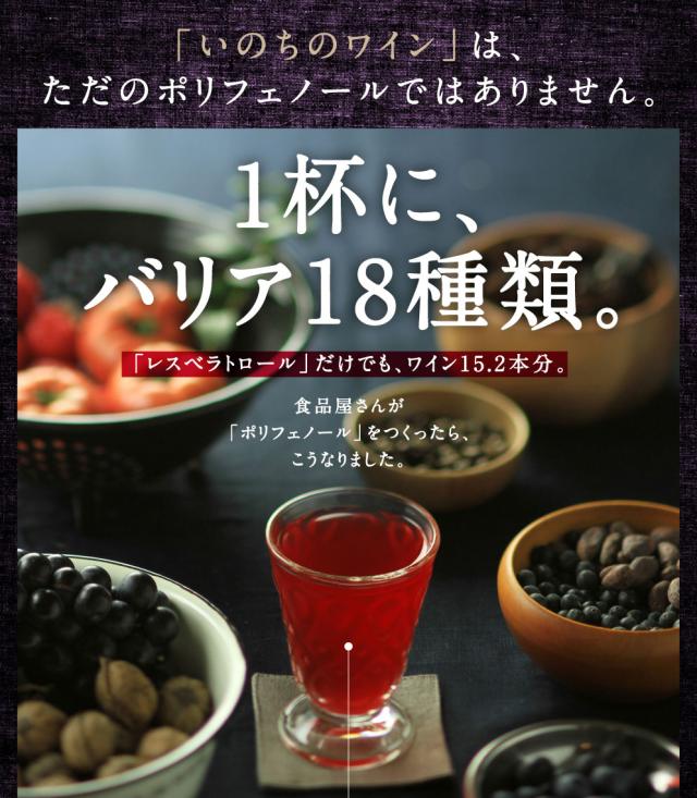 食品屋さんがつくった365日続ける充実ポリフェノール飲料。贅沢18種類のポリフェノールを1杯につめて、「レスベラトロール」だけでもワイン15.2本分。1日1杯のからだのお守り、あなたもはじめてみませんか?