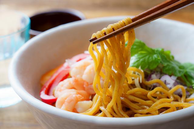 小麦粉、小麦たん白、卵白粉末、酒精、ソルビット、乳酸ナトリウム、食塩、かんすい、乳化材、着色料(クチナシ、ビタミンB2)