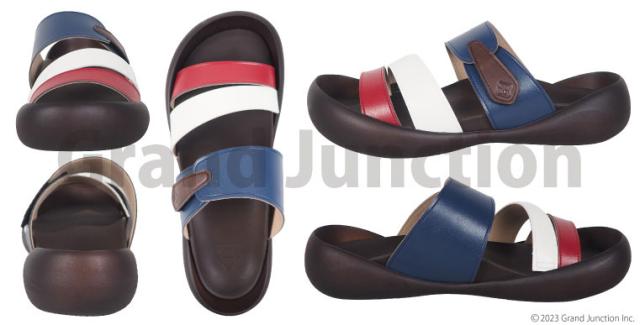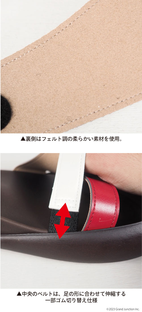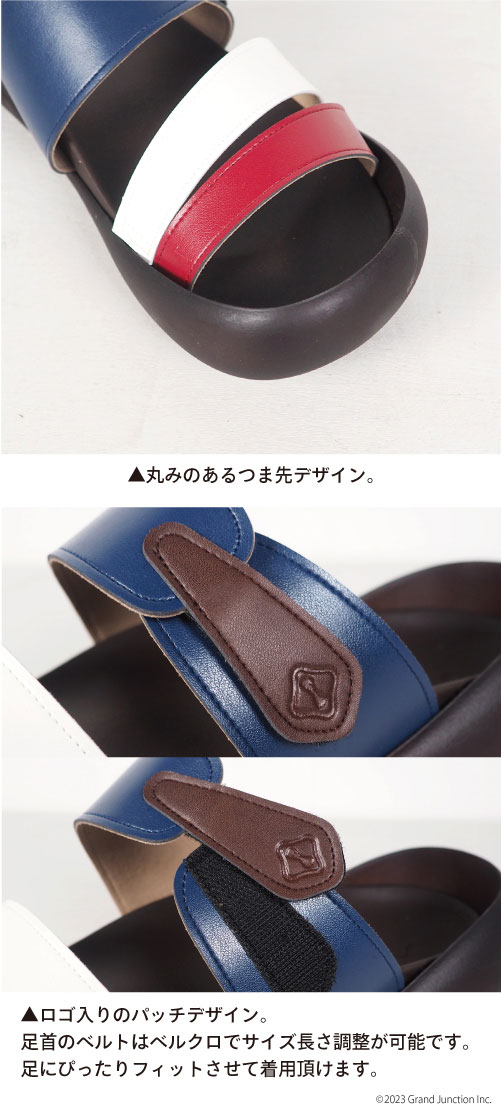 つま先側のベルト2本は足のカタチに合わせて伸縮する一部ゴム切替仕様。 甲のベルトはマジックテープ式で着脱が簡単!牛革のロゴパッチでカジュアルスタイルに高級感をプラス。