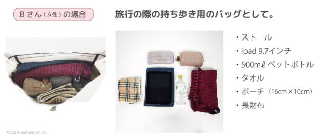 | 【Aさん】 COMMENT : 子どもと近所の公園に行くときなど、両手をあけつつ、荷物もベンチに置かずに持っておきたいときに便利です。 |