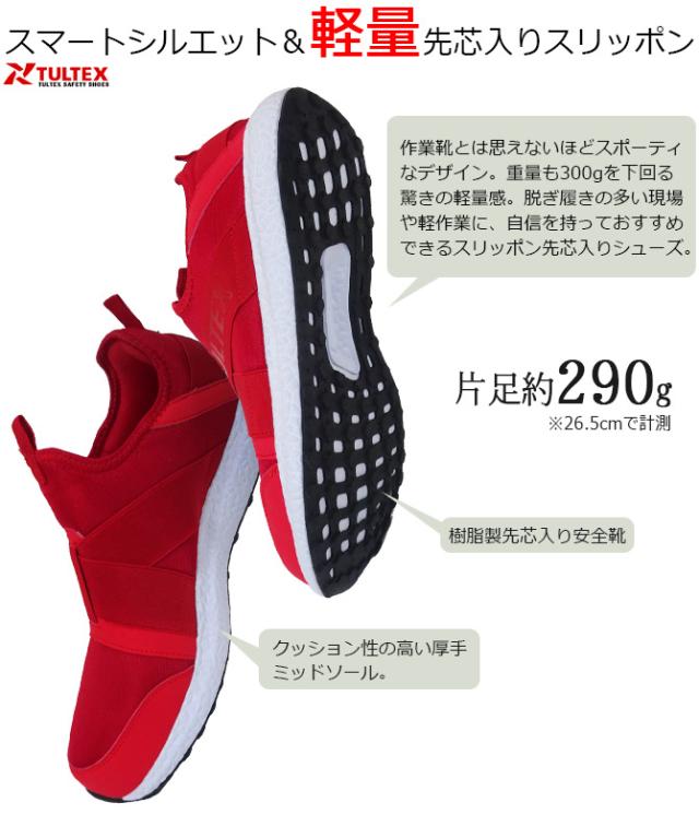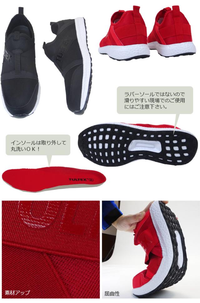 | TULTEX(タルテックス)のストリート&スポーツカジュアルなルックスの安全靴です。 アッパーはナイロンメッシュ素材で通気性が良く、ムレにくく快適です。 履き口は足をすべり込ませて簡単に履けるスリップオン仕様で脱ぎ履きがしやすく、ゴムストラップの程よい締め付けでフィット感も良好です。 ミッドソールにはEVAを使用していてクッション性も抜群。 先芯は樹脂先芯(JIS L級相当)を使用していますので軽量で疲れにくいのもポイントです。 | ||||||